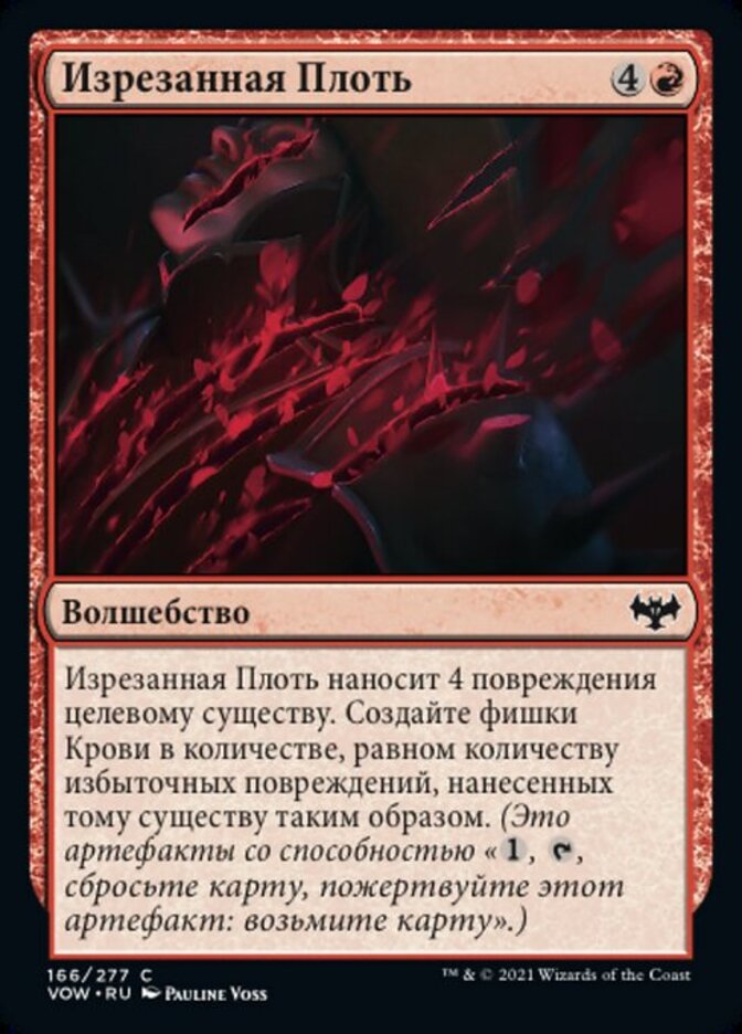 | Rules | Lacerate Flesh deals 4 damage to target creature. Create a number of Blood tokens equal to the amount of excess damage dealt to that creature this way. (They're artifacts with ", , Discard a card, Sacrifice this artifact: Draw a card.") |