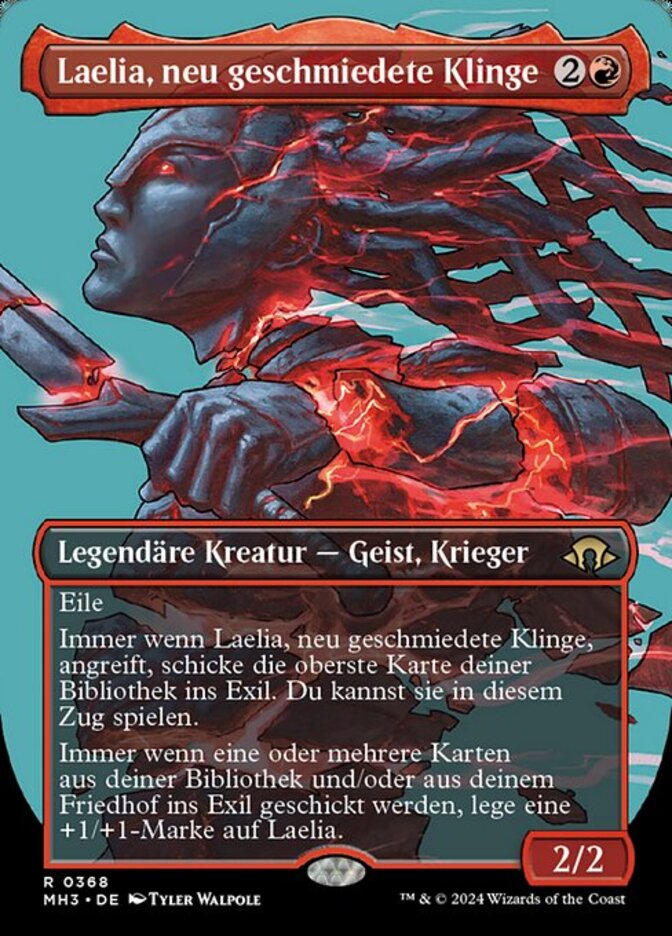| Rules | Haste Whenever Laelia, the Blade Reforged attacks, exile the top card of your library. You may play that card this turn. Whenever one or more cards are put into exile from your library and/or your graveyard, put a +1/+1 counter on Laelia. |
