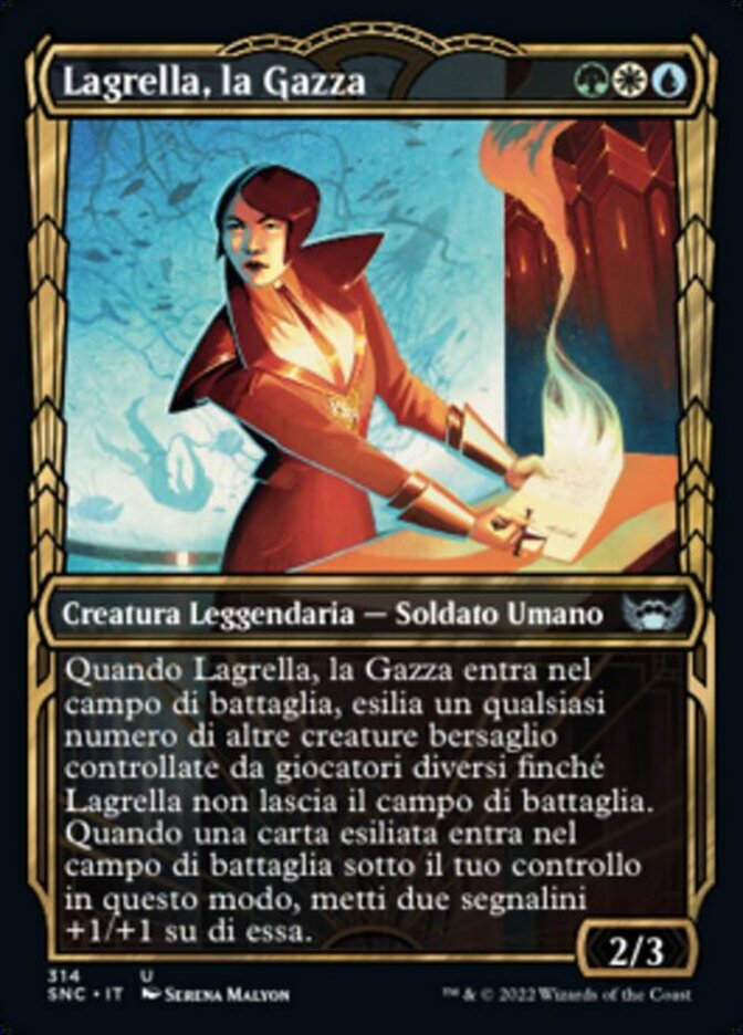 | Rules | When Lagrella, the Magpie enters the battlefield, exile any number of other target creatures controlled by different players until Lagrella leaves the battlefield. When an exiled card enters the battlefield under your control this way, put two +1/+1 counters on it. |