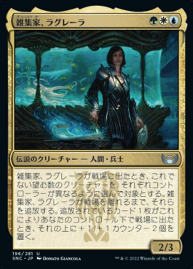 | Rules | When Lagrella, the Magpie enters the battlefield, exile any number of other target creatures controlled by different players until Lagrella leaves the battlefield. When an exiled card enters the battlefield under your control this way, put two +1/+1 counters on it. |