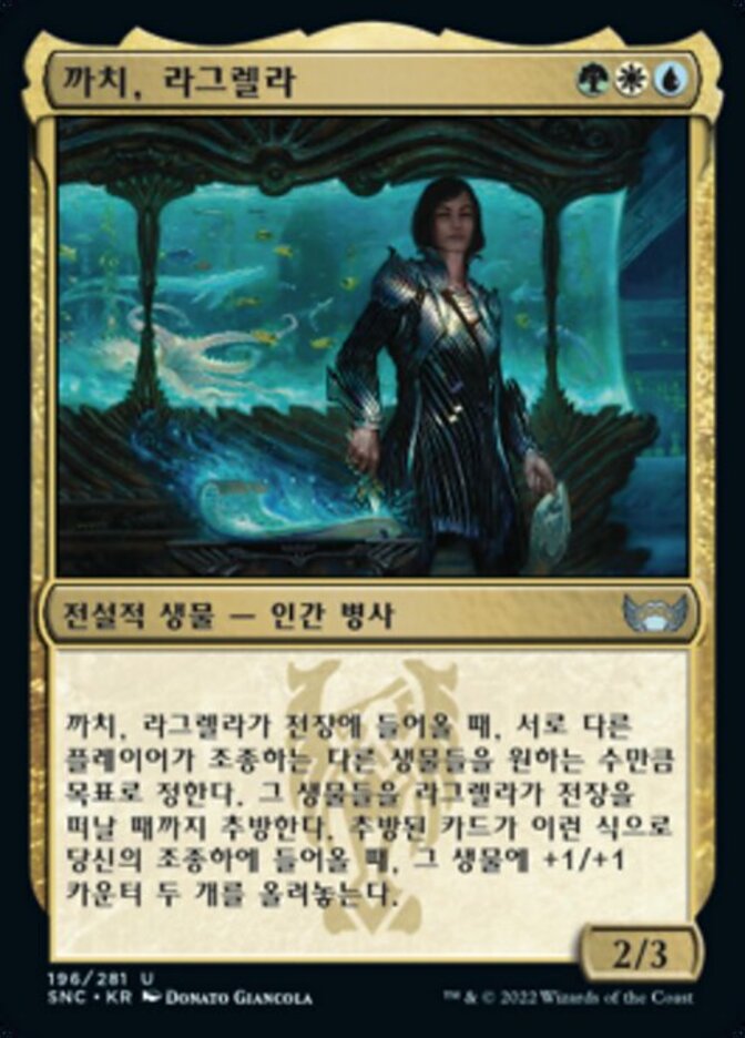 | Rules | When Lagrella, the Magpie enters the battlefield, exile any number of other target creatures controlled by different players until Lagrella leaves the battlefield. When an exiled card enters the battlefield under your control this way, put two +1/+1 counters on it. |