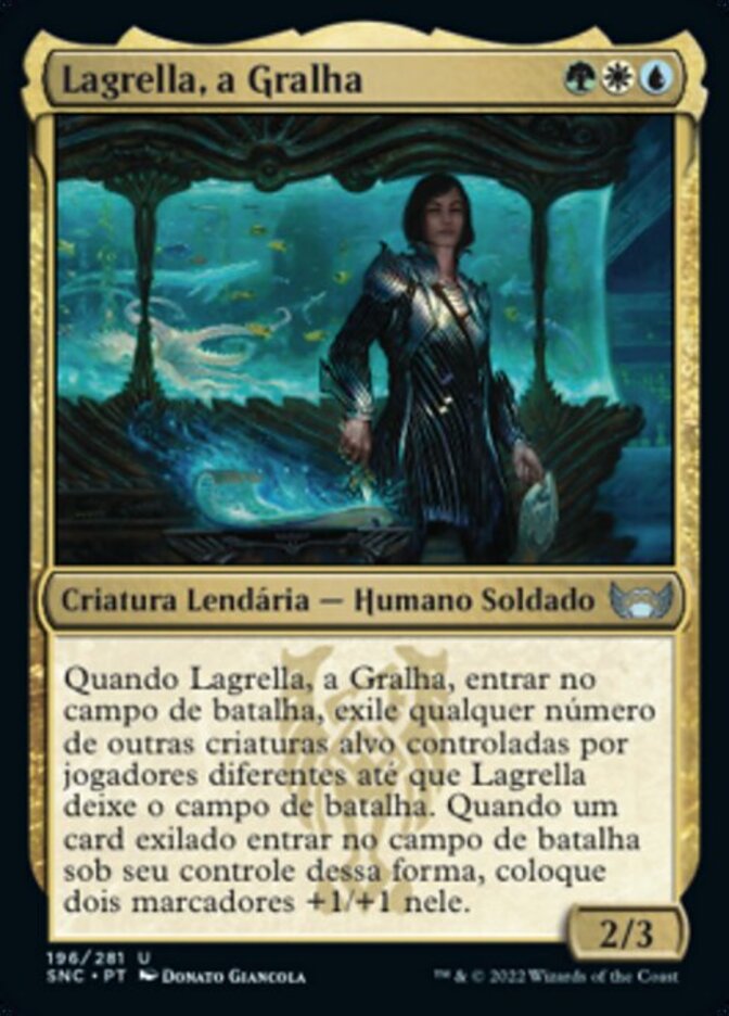| Rules | When Lagrella, the Magpie enters the battlefield, exile any number of other target creatures controlled by different players until Lagrella leaves the battlefield. When an exiled card enters the battlefield under your control this way, put two +1/+1 counters on it. |