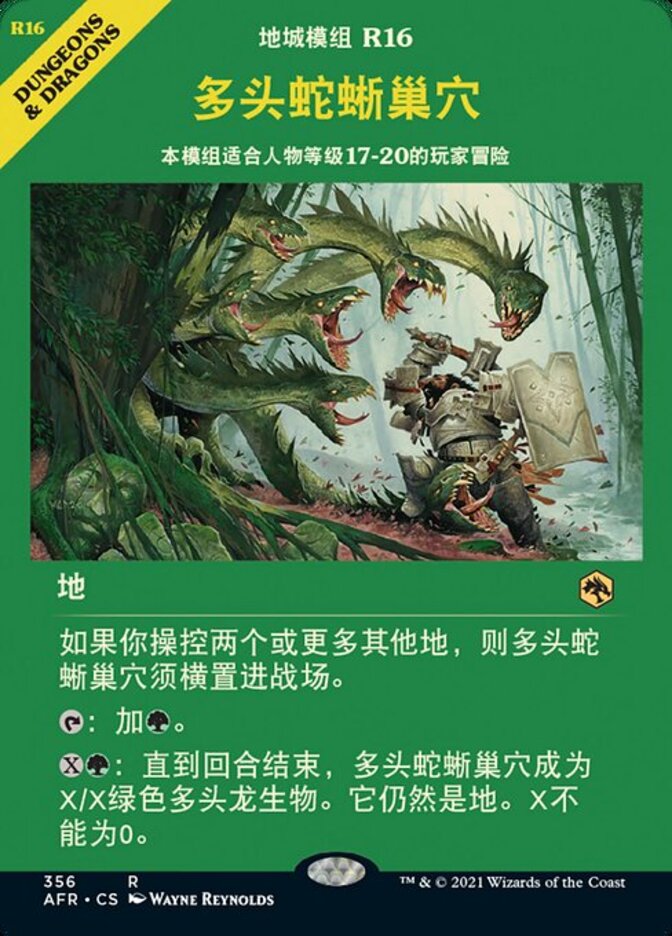 | Rules | If you control two or more other lands, Lair of the Hydra enters the battlefield tapped. : Add . : Until end of turn, Lair of the Hydra becomes an X/X green Hydra creature. It's still a land. X can't be 0. |