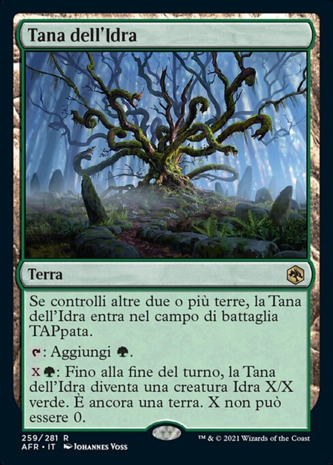 | Rules | If you control two or more other lands, Lair of the Hydra enters the battlefield tapped. : Add . : Until end of turn, Lair of the Hydra becomes an X/X green Hydra creature. It's still a land. X can't be 0. |