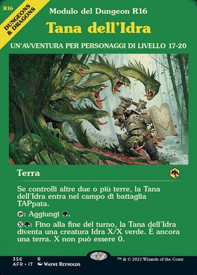 | Rules | If you control two or more other lands, Lair of the Hydra enters the battlefield tapped. : Add . : Until end of turn, Lair of the Hydra becomes an X/X green Hydra creature. It's still a land. X can't be 0. |