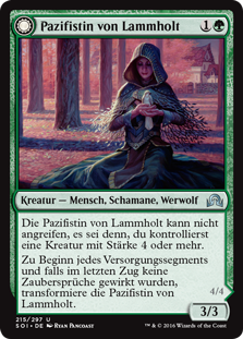 | Rules | Lambholt Pacifist can't attack unless you control a creature with power 4 or greater. At the beginning of each upkeep, if no spells were cast last turn, transform Lambholt Pacifist. // At the beginning of each upkeep, if a player cast two or more spells last turn, transform Lambholt Butcher. |