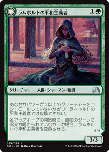 | Rules | Lambholt Pacifist can't attack unless you control a creature with power 4 or greater. At the beginning of each upkeep, if no spells were cast last turn, transform Lambholt Pacifist. // At the beginning of each upkeep, if a player cast two or more spells last turn, transform Lambholt Butcher. |