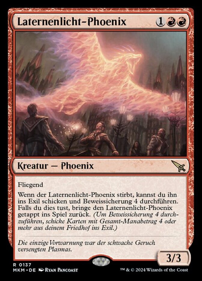 | Rules | Flying When Lamplight Phoenix dies, you may exile it and collect evidence 4. If you do, return Lamplight Phoenix to the battlefield tapped. (To collect evidence 4, exile cards with total mana value 4 or greater from your graveyard.) |