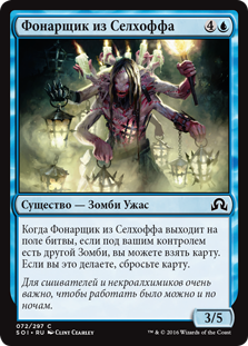 | Rules | When Lamplighter of Selhoff enters the battlefield, if you control another Zombie, you may draw a card. If you do, discard a card. |
