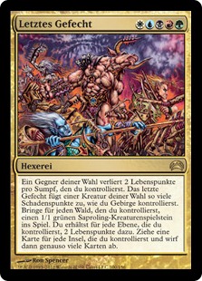 | Rules | Target opponent loses 2 life for each Swamp you control. Last Stand deals damage to target creature equal to the number of Mountains you control. Create a 1/1 green Saproling creature token for each Forest you control. You gain 2 life for each Plains you control. Draw a card for each Island you control, then discard that many cards. |