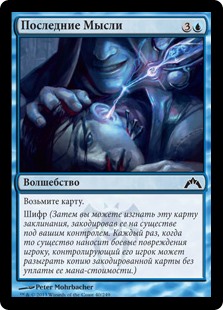 | Rules | Draw a card. Cipher (Then you may exile this spell card encoded on a creature you control. Whenever that creature deals combat damage to a player, its controller may cast a copy of the encoded card without paying its mana cost.) |
