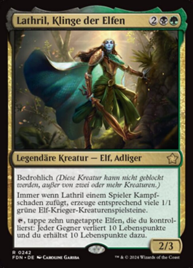 | Rules | Menace Whenever Lathril, Blade of the Elves deals combat damage to a player, create that many 1/1 green Elf Warrior creature tokens. , Tap ten untapped Elves you control: Each opponent loses 10 life and you gain 10 life. |