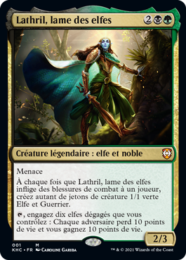 | Rules | Menace Whenever Lathril, Blade of the Elves deals combat damage to a player, create that many 1/1 green Elf Warrior creature tokens. , Tap ten untapped Elves you control: Each opponent loses 10 life and you gain 10 life. |