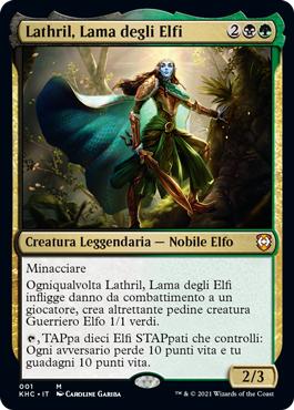 | Rules | Menace Whenever Lathril, Blade of the Elves deals combat damage to a player, create that many 1/1 green Elf Warrior creature tokens. , Tap ten untapped Elves you control: Each opponent loses 10 life and you gain 10 life. |