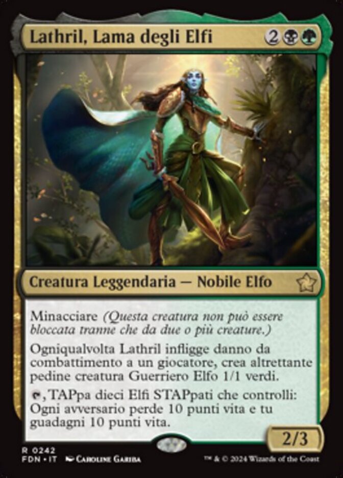 | Rules | Menace Whenever Lathril, Blade of the Elves deals combat damage to a player, create that many 1/1 green Elf Warrior creature tokens. , Tap ten untapped Elves you control: Each opponent loses 10 life and you gain 10 life. |