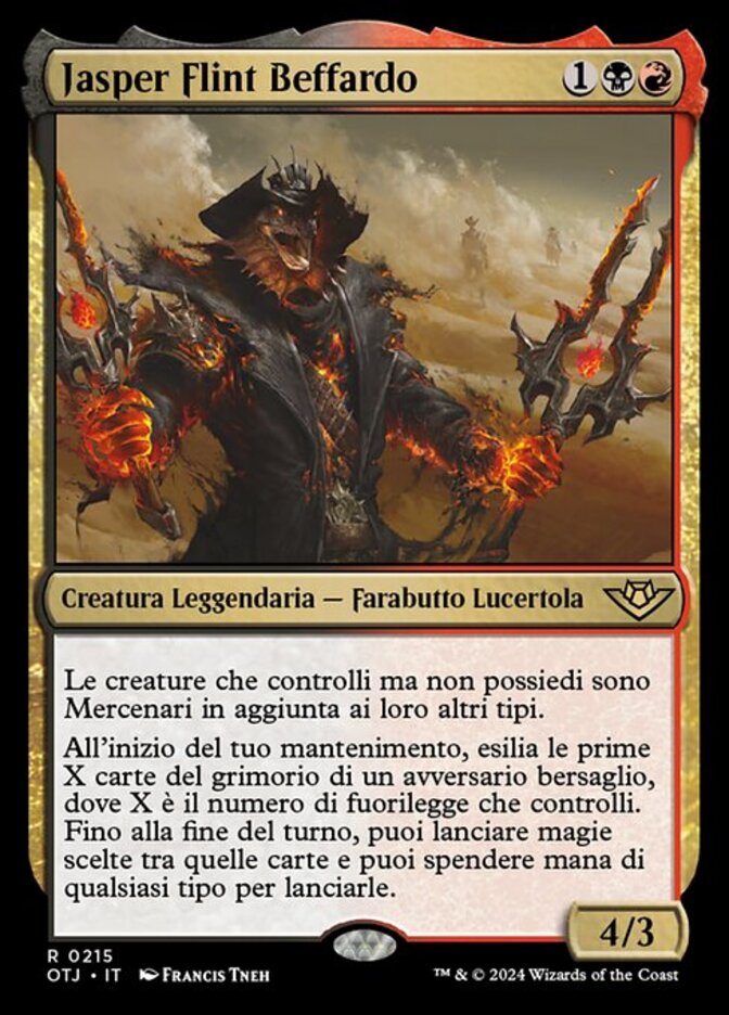 | Rules | Creatures you control but don't own are Mercenaries in addition to their other types. At the beginning of your upkeep, exile the top X cards of target opponent's library, where X is the number of outlaws you control. Until end of turn, you may cast spells from among those cards, and mana of any type can be spent to cast those spells. |