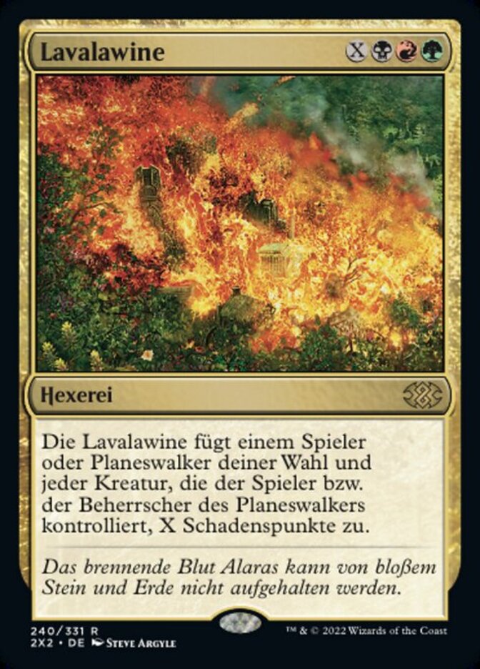 | Rules | Lavalanche deals X damage to target player or planeswalker and each creature that player or that planeswalker's controller controls. |