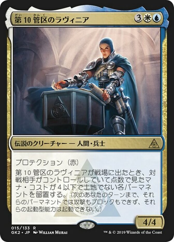 | Rules | Protection from red When Lavinia of the Tenth enters the battlefield, detain each nonland permanent your opponents control with mana value 4 or less. (Until your next turn, those permanents can't attack or block and their activated abilities can't be activated.) |
