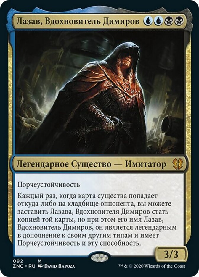 | Rules | Hexproof Whenever a creature card is put into an opponent's graveyard from anywhere, you may have Lazav, Dimir Mastermind become a copy of that card, except its name is Lazav, Dimir Mastermind, it's legendary in addition to its other types, and it has hexproof and this ability. |