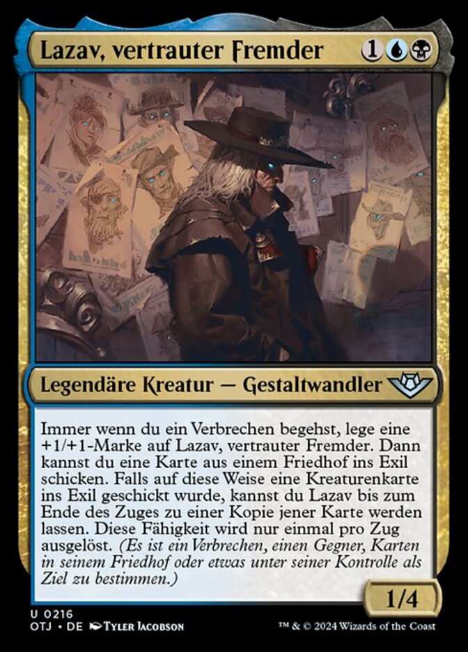 | Rules | Whenever you commit a crime, put a +1/+1 counter on Lazav, Familiar Stranger. Then you may exile a card from a graveyard. If a creature card was exiled this way, you may have Lazav become a copy of that card until end of turn. This ability triggers only once each turn. (Targeting opponents, anything they control, and/or cards in their graveyards is a crime.) |