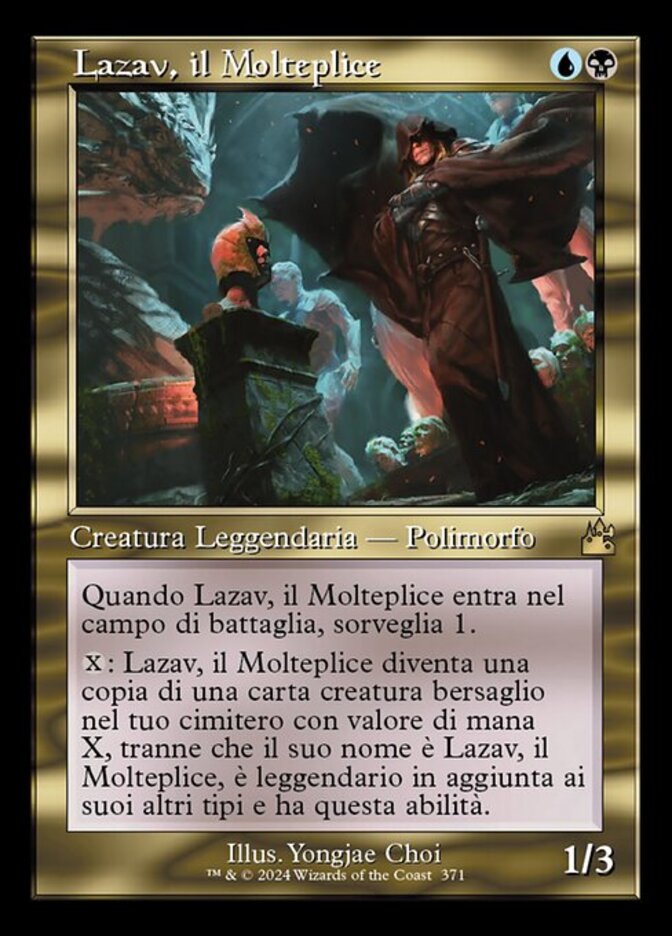 | Rules | When Lazav, the Multifarious enters the battlefield, surveil 1. (Look at the top card of your library. You may put it into your graveyard.) : Lazav, the Multifarious becomes a copy of target creature card in your graveyard with mana value X, except its name is Lazav, the Multifarious, it's legendary in addition to its other types, and it has this ability. |
