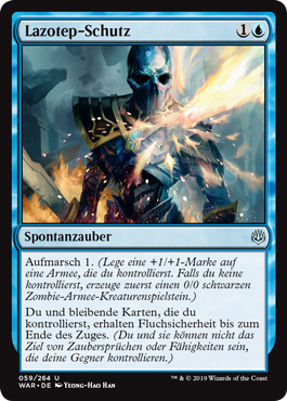 | Rules | Amass 1. (Put a +1/+1 counter on an Army you control. If you don't control one, create a 0/0 black Zombie Army creature token first.) You and permanents you control gain hexproof until end of turn. (You and they can't be the targets of spells or abilities your opponents control.) |