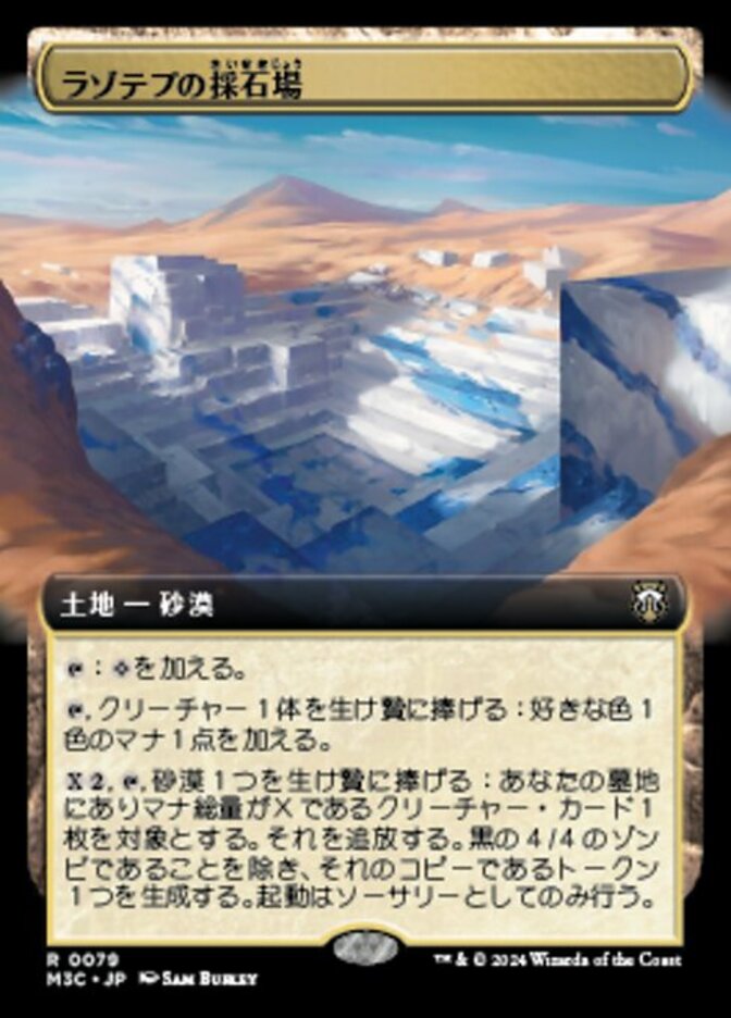 | Rules | : Add . , Sacrifice a creature: Add one mana of any color. , , Sacrifice a Desert: Exile target creature card with mana value X from your graveyard. Create a token that's a copy of it, except it's a 4/4 black Zombie. Activate only as a sorcery. |
