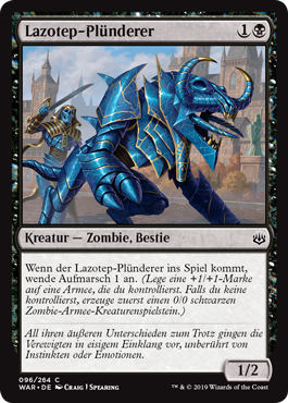 | Rules | When Lazotep Reaver enters the battlefield, amass 1. (Put a +1/+1 counter on an Army you control. If you don't control one, create a 0/0 black Zombie Army creature token first.) |