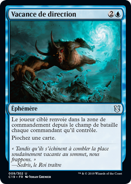 | Rules | Target player returns each commander they control from the battlefield to the command zone. Draw a card. |