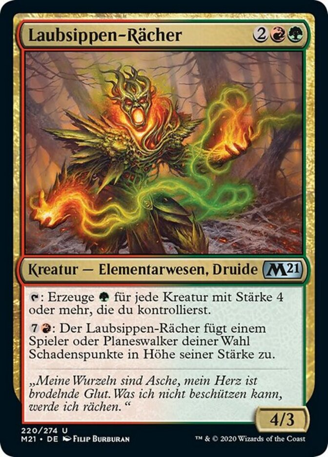 | Rules | : Add for each creature with power 4 or greater you control. : Leafkin Avenger deals damage equal to its power to target player or planeswalker. |