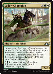 | Rules | Whenever Ledev Champion attacks, you may tap any number of untapped creatures you control. Ledev Champion gets +1/+1 until end of turn for each creature tapped this way. : Create a 1/1 white Soldier creature token with lifelink. |