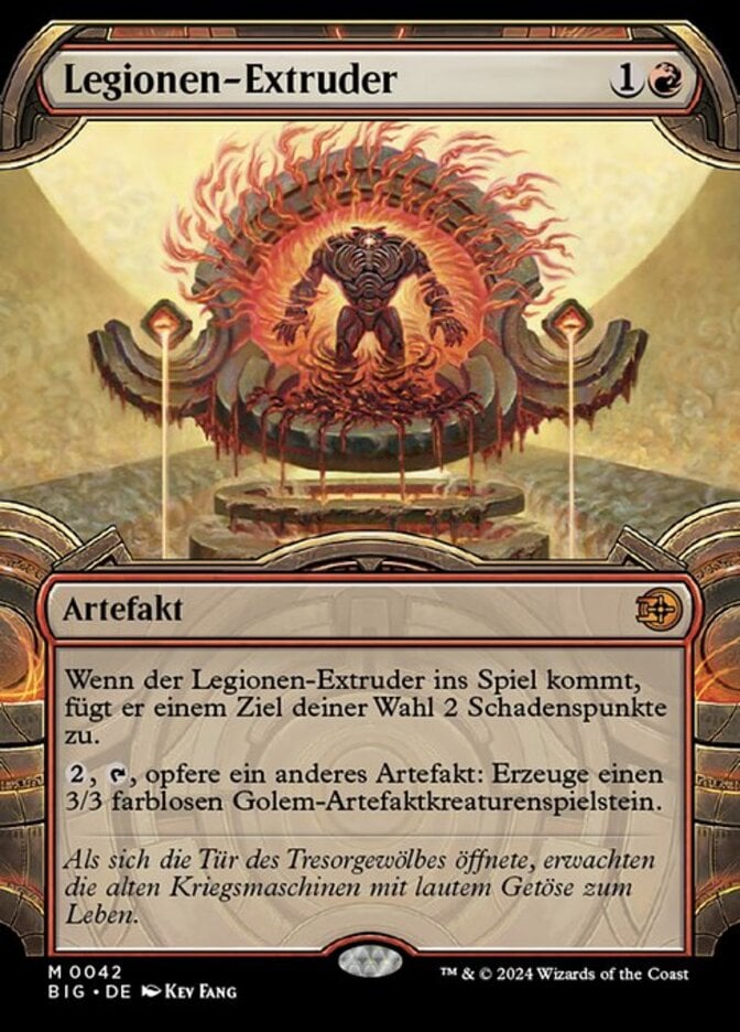 | Rules | When Legion Extruder enters the battlefield, it deals 2 damage to any target. , , Sacrifice another artifact: Create a 3/3 colorless Golem artifact creature token. |