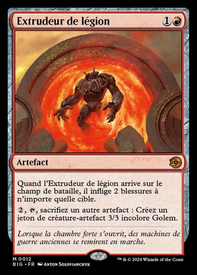 | Rules | When Legion Extruder enters the battlefield, it deals 2 damage to any target. , , Sacrifice another artifact: Create a 3/3 colorless Golem artifact creature token. |