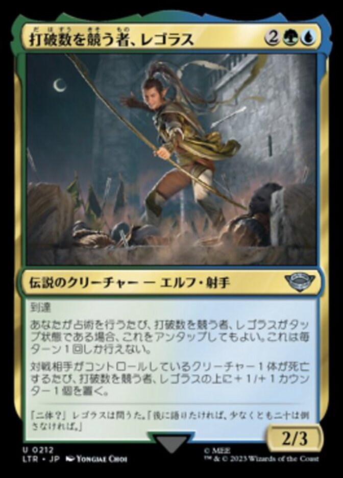 | Rules | Reach Whenever you scry, if Legolas, Counter of Kills is tapped, you may untap it. Do this only once each turn. Whenever a creature an opponent controls dies, put a +1/+1 counter on Legolas. |