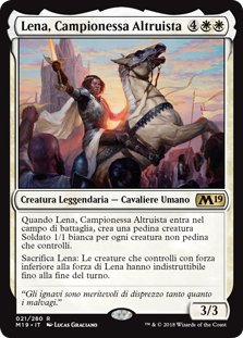 | Rules | When Lena, Selfless Champion enters the battlefield, create a 1/1 white Soldier creature token for each nontoken creature you control. Sacrifice Lena: Creatures you control with power less than Lena's power gain indestructible until end of turn. |
