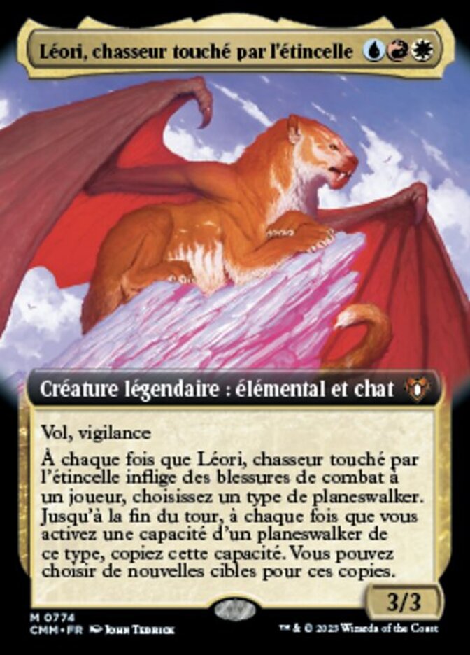 | Rules | Flying, vigilance Whenever Leori, Sparktouched Hunter deals combat damage to a player, choose a planeswalker type. Until end of turn, whenever you activate an ability of a planeswalker of that type, copy that ability. You may choose new targets for the copies. |