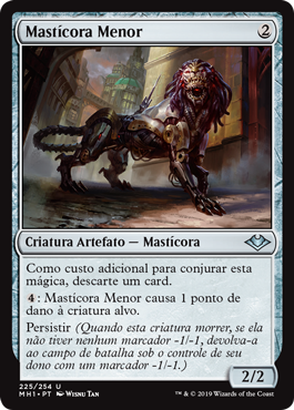 | Rules | As an additional cost to cast this spell, discard a card. : Lesser Masticore deals 1 damage to target creature. Persist (When this creature dies, if it had no -1/-1 counters on it, return it to the battlefield under its owner's control with a -1/-1 counter on it.) |