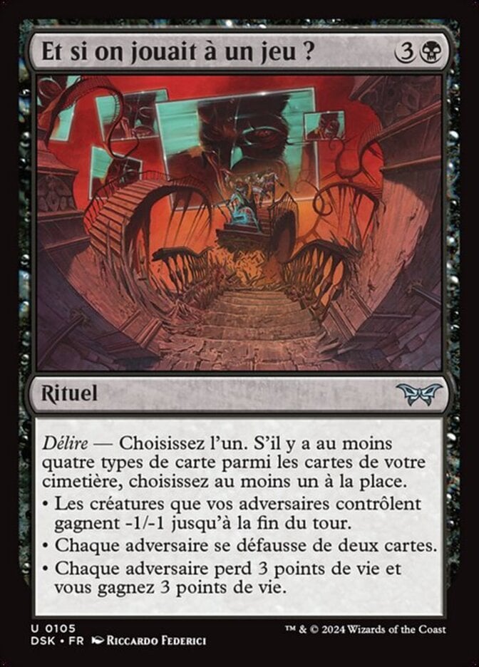 | Rules | Delirium — Choose one. If there are four or more card types among cards in your graveyard, choose one or more instead. • Creatures your opponents control get -1/-1 until end of turn. • Each opponent discards two cards. • Each opponent loses 3 life and you gain 3 life. |