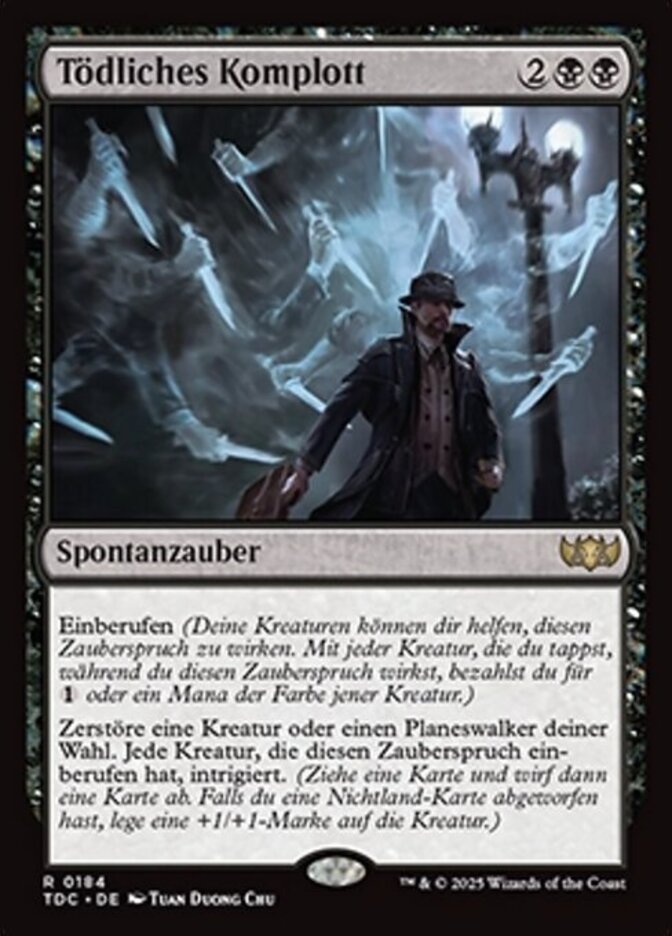 | Rules | Convoke (Your creatures can help cast this spell. Each creature you tap while casting this spell pays for or one mana of that creature's color.) Destroy target creature or planeswalker. Each creature that convoked Lethal Scheme connives. (Draw a card, then discard a card. If you discarded a nonland card, put a +1/+1 counter on that creature.) |