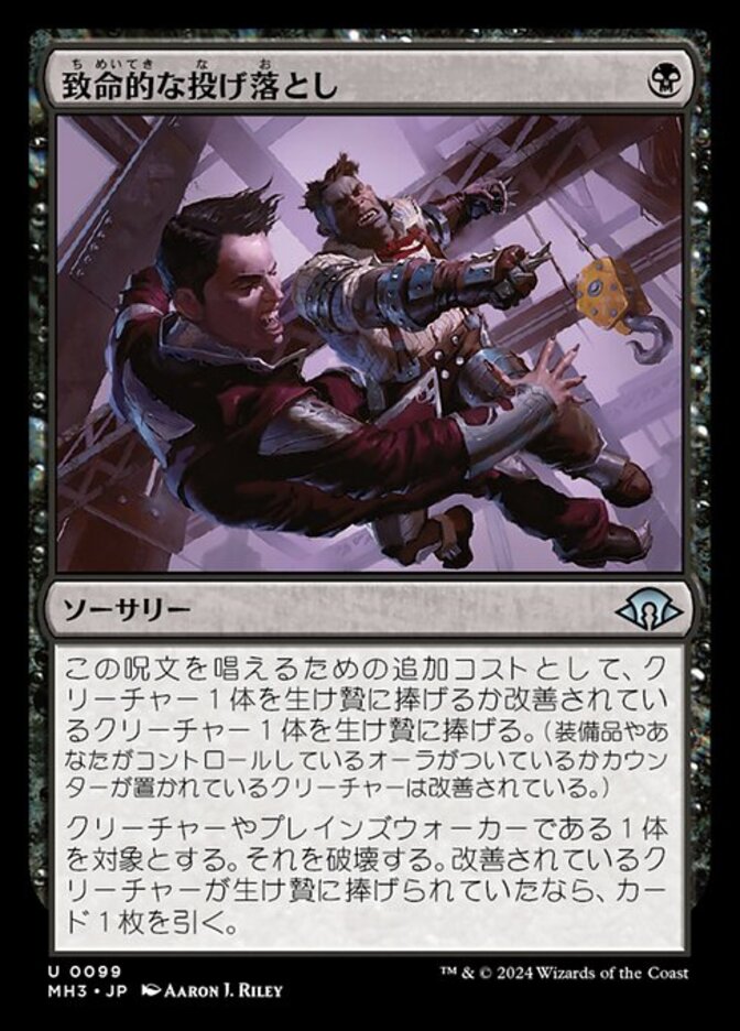 | Rules | As an additional cost to cast this spell, sacrifice a creature or sacrifice a modified creature. (Equipment, Auras you control, and counters are modifications.) Destroy target creature or planeswalker. If the modified creature was sacrificed, draw a card. |