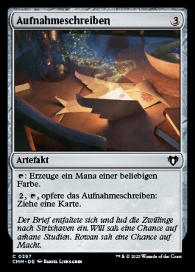 | Rules | : Add one mana of any color. , , Sacrifice Letter of Acceptance: Draw a card. |