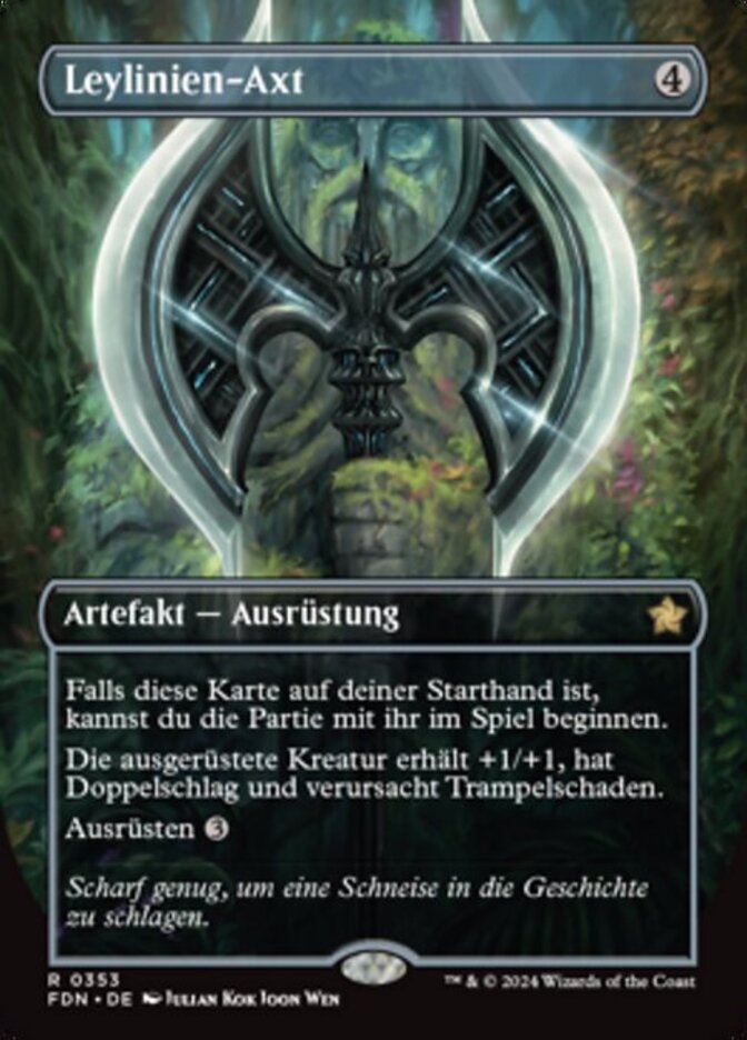 | Rules | If this card is in your opening hand, you may begin the game with it on the battlefield. Equipped creature gets +1/+1 and has double strike and trample. Equip (: Attach to target creature you control. Equip only as a sorcery.) |