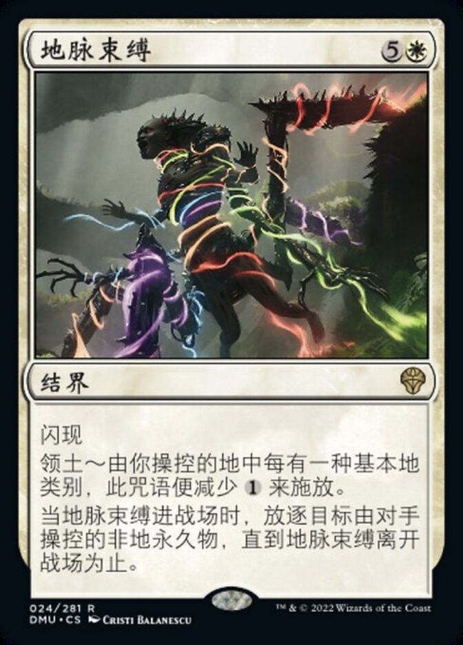 | Rules | Flash Domain — This spell costs less to cast for each basic land type among lands you control. When Leyline Binding enters the battlefield, exile target nonland permanent an opponent controls until Leyline Binding leaves the battlefield. |