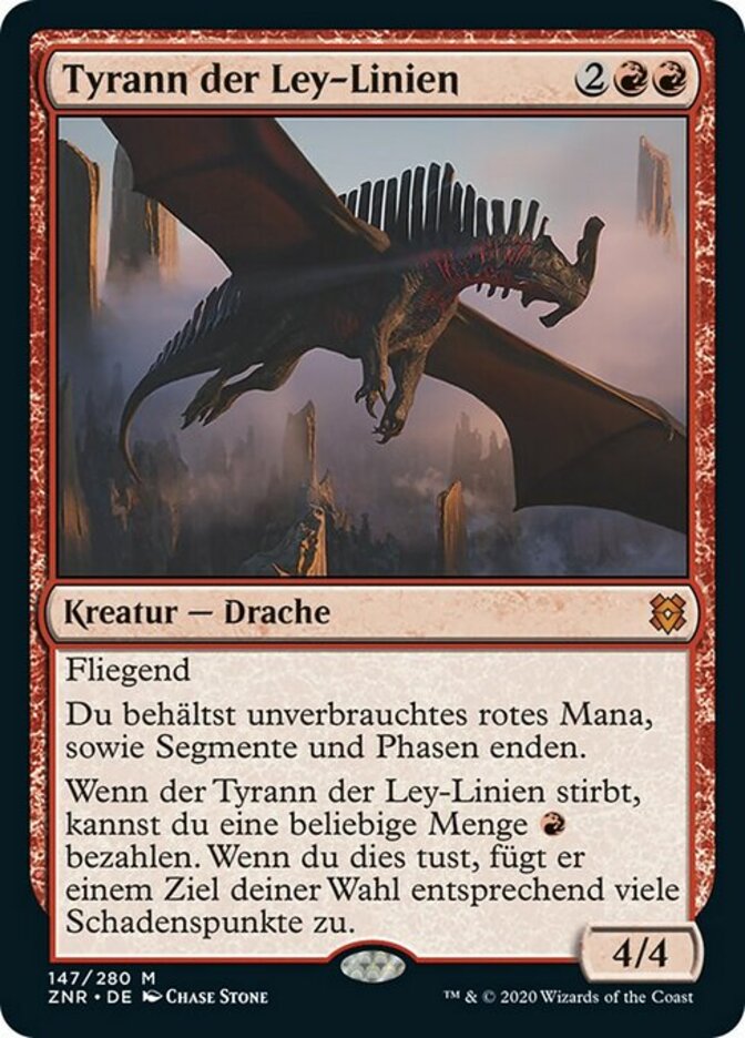 | Rules | Flying You don't lose unspent red mana as steps and phases end. When Leyline Tyrant dies, you may pay any amount of . When you do, it deals that much damage to any target. |