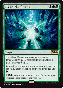 | Rules | If Leyline of Abundance is in your opening hand, you may begin the game with it on the battlefield. Whenever you tap a creature for mana, add an additional . : Put a +1/+1 counter on each creature you control. |