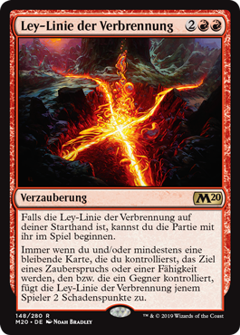 | Rules | If Leyline of Combustion is in your opening hand, you may begin the game with it on the battlefield. Whenever you and/or at least one permanent you control becomes the target of a spell or ability an opponent controls, Leyline of Combustion deals 2 damage to that player. |