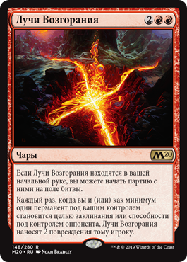 | Rules | If Leyline of Combustion is in your opening hand, you may begin the game with it on the battlefield. Whenever you and/or at least one permanent you control becomes the target of a spell or ability an opponent controls, Leyline of Combustion deals 2 damage to that player. |