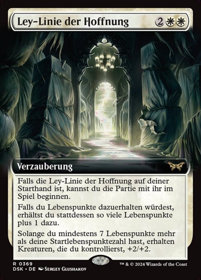 | Rules | If Leyline of Hope is in your opening hand, you may begin the game with it on the battlefield. If you would gain life, you gain that much life plus 1 instead. As long as you have at least 7 life more than your starting life total, creatures you control get +2/+2. |