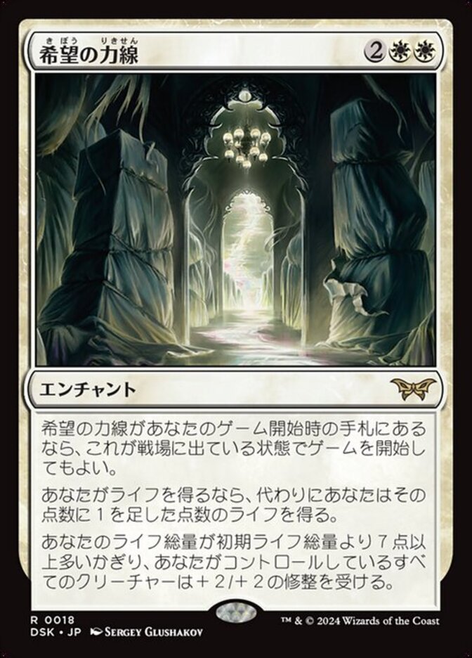 | Rules | If Leyline of Hope is in your opening hand, you may begin the game with it on the battlefield. If you would gain life, you gain that much life plus 1 instead. As long as you have at least 7 life more than your starting life total, creatures you control get +2/+2. |