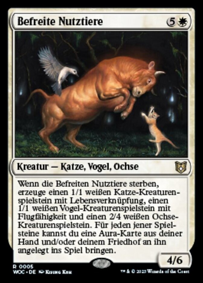 | Rules | When Liberated Livestock dies, create a 1/1 white Cat creature token with lifelink, a 1/1 white Bird creature token with flying, and a 2/4 white Ox creature token. For each of those tokens, you may put an Aura card from your hand and/or graveyard onto the battlefield attached to it. |